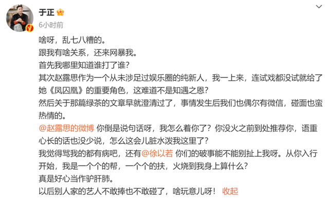 于正发文表示,热议话题跟自己无关,不知道谁打了谁,当年试戏都没试就让纯新人的赵露思出演了《凤求凰》。