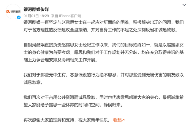 而赵露思发长文后,经纪公司银河酷娱回应,称直接负责赵露思经纪工作以来以赵露思女士的身心健康为首要考虑。