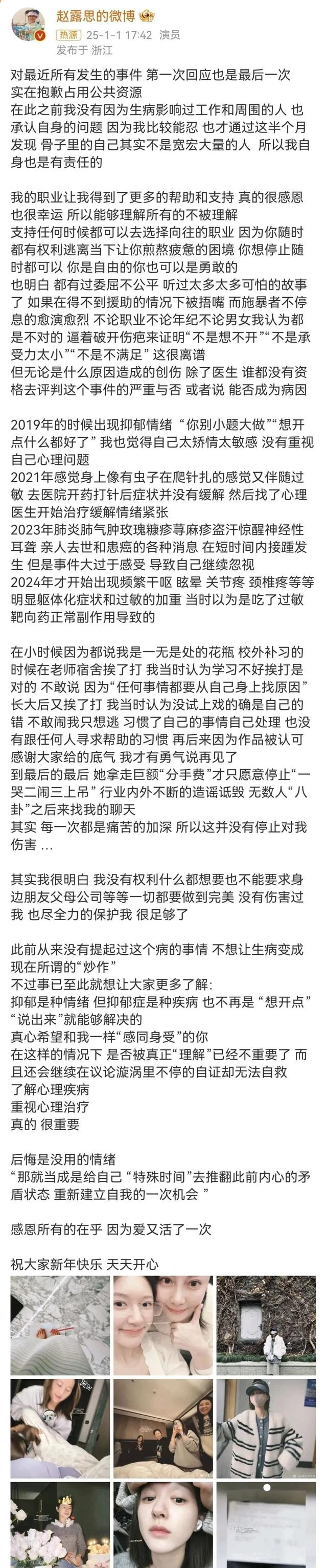 在文章的末尾,赵露思写道:“了解心理疾病,重视心理治疗真的很重要”。