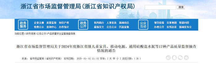 浙江省市场监督管理局发布2024年度浙江省级儿童家具、移动电源、通用硅酸盐水泥等17种产品质量监督抽查情况