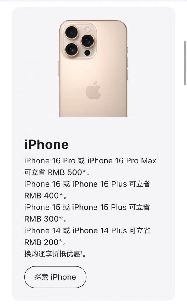 北京青年报记者看到,iPhone 16 Pro 或 iPhone 16 Pro Max 可立省500元,iPhone 16 或 iPhone 16 Plus 可立省 400元,iPhone 15和iPhone 14 系列也有优惠。15 英寸 MacBook Air (M3) 可立省800元,13 英寸 MacBook Air (M3) 可立省 700元。11 英寸或 13 英寸 iPad Pro 可立省 400元,11 英寸或 13 英寸 iPad Air 可立省300元。此外 Apple Watch、AirPods、Apple Pencil等均有优惠。