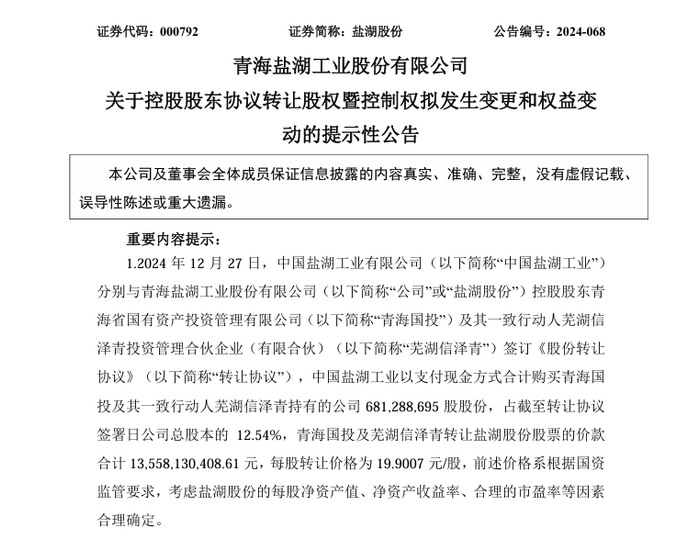 2024年12月31日,盐湖股份(000792)发布关于控股股东协议转让股权暨控制权拟发生变更和权益变动的提示性公告。2024年12月27日,中国盐湖工业有限公司(下称“中国盐湖”)与上市公司控股股东青海省国有资产投资管理有限公司(下称“青海国投”)及其一致行动人芜湖信泽青投资管理合伙企业(下称“芜湖信泽青”)签署了股份转让协议。根据协议,中国盐湖以现金方式购买青海国投及其一致行动人持有的公司6.81亿股股份,占公司总股本的12.54%。转让总价为135.58亿元,每股转让价格为19.9007元。