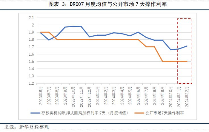 从月度利率水平看,12月月度平均利率或由于跨年等因素稍有走高。DR007的12月月度利率报1.71%,比11月月度利率1.67%高4个基点。光大银行分析指出,2024年12月初以来,央行根据市场流动性情况灵活操作,合理回收短期过剩流动,加上政府债券发行加快等扰动,短期资金利率略有抬升,但整体处于政策利率附近波动,资金面运行平稳。此外,信达证券分析表示,DR007区间仍维持在了1.65%-1.7%,后续大幅走高的概率有限,短端利率的下行空间可能同样受限。