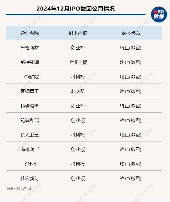 2024年12月,A股市场共有10家公司撤回了IPO项目,分别为米格新材、新特能源、中钢矿院、豪钢重工、科峰股份、筠诚和瑞、长光卫星、海谱润斯、飞仕得和佳宏新材。其中来自创业板的公司有5家,占比达到一半。