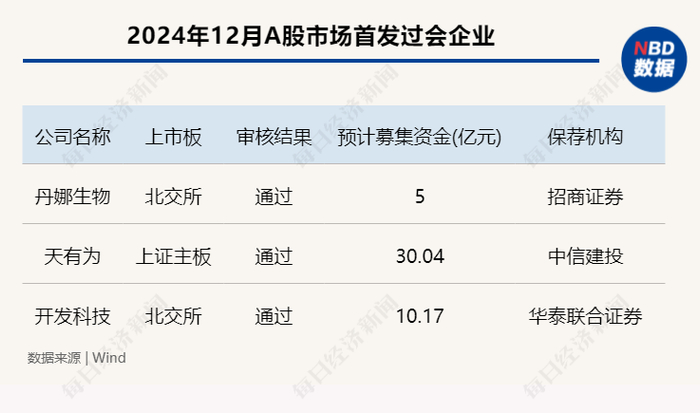 2024年12月,A股市场总共有3家公司迎来首发上会,分别为来自北交所的丹娜生物和开发科技,以及来自上证主板市场的天有为,三家公司均成功过会。