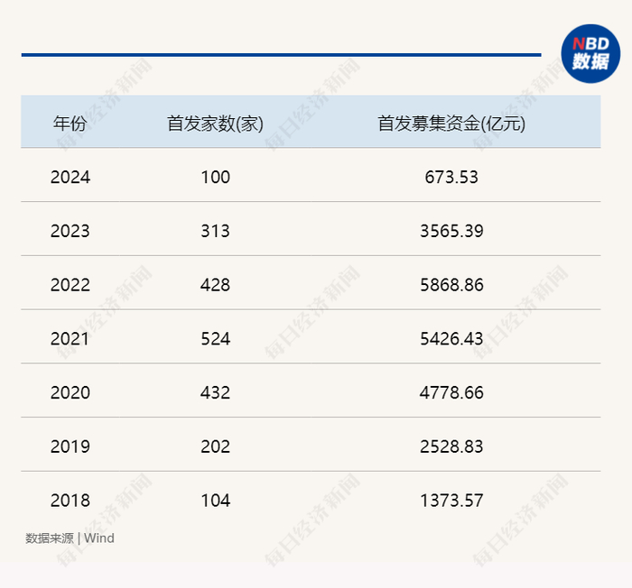 在IPO节奏阶段性放缓的背景下,2024年的新股数量也低于前几年。具体来看,2024年有100家公司完成首发上市,募集资金总额达673.53亿元。其中,2024年首发上市数量仅为2021年度的两成不到,募资总额则尚不及2022年度的八分之一。