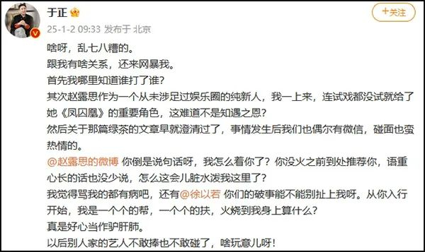 1月2日,@于正 发文称,“啥呀,乱七八糟的。跟我有啥关系,还来网暴我”。