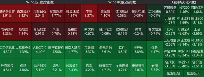 行业板块少数上涨,零售、贵金属、休闲用品、家用电器等板块逆势拉升。券商、电脑硬件、汽车、保险等板块均跌超4%。