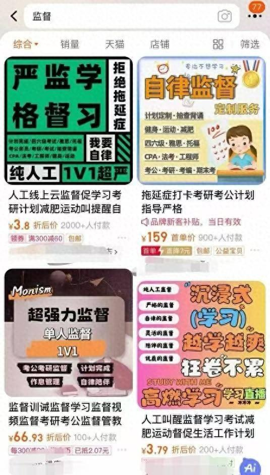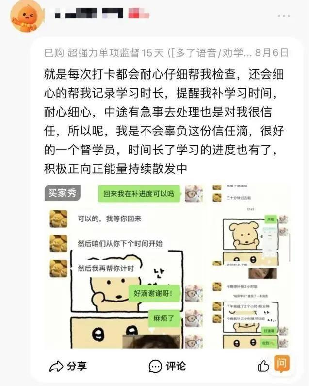 从店家宣传来看,“监督不是机械打卡、冷冰冰提醒”,监督员是“高分上岸的优秀师兄师姐”,因此服务除了监督,还包括“经验分享”“情绪价值输出”等。还有店铺甚至有“真人学霸一对一监督”,价格需另行协商。