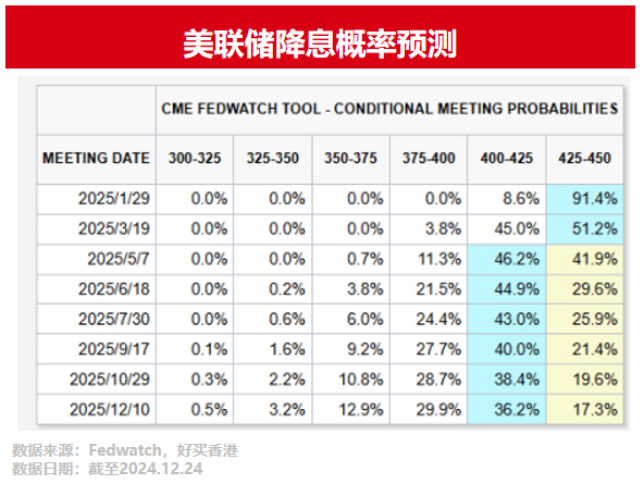 2024年12月议息会议上,美联储如期降息,但整体基调转鹰,受此影响,美股大幅调整。从12月议息会议的点阵图来看,预计2025全年美联储仅会降息两次。