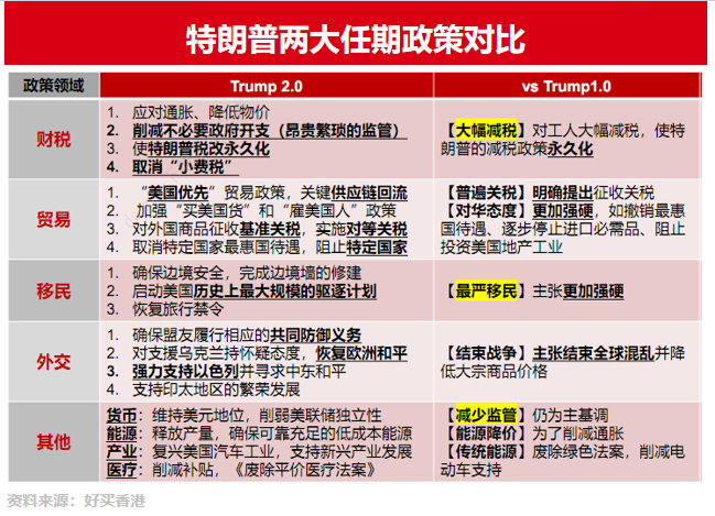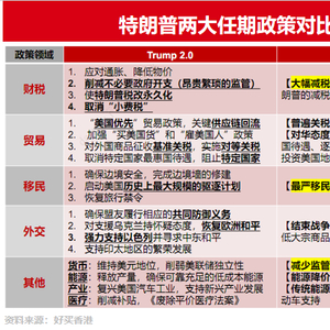 本月特朗普将重返白宫,其一系列政策主张也将陆续落地,与第一任期相比,特朗普2.0时代或在减税与移民政策上有更激进的举措。