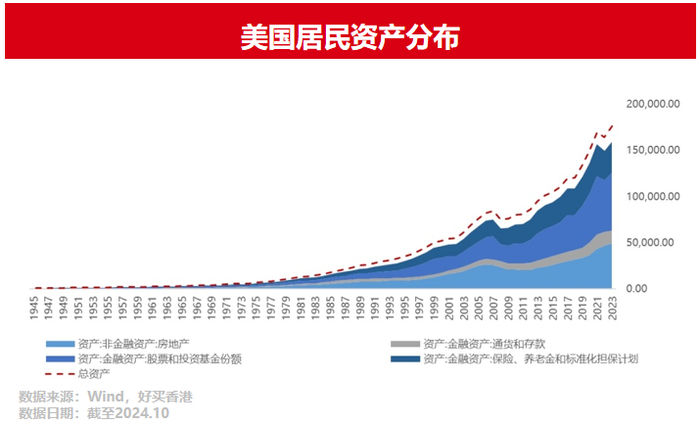 截至2024年末,地产、股票占美国居民净财富的50%以上,美股在居民资产负债表中的占比则达30%。