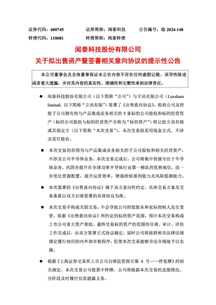 实际上,闻泰科技在2024年12月30日与立讯有限签署了《出售意向协议》,拟将公司及控股子公司拥有的与产品集成业务相关的 9 家标的公司股权和标的经营资产转让给立讯有限或其指定方。
