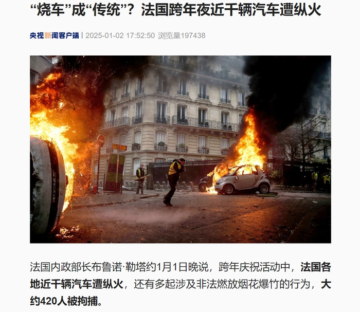每年12月31日晚至次年1月1日晨,法国通常会发生多起“烧车”事件,嫌疑人多为年轻男子,这类破坏行为几乎成为法国跨年夜“传统”。