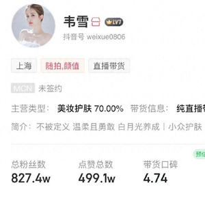 早在2010年前后,韦雪曾在博客走红。2024年10月,韦雪以“清醒大女人”人设再次在抖音直播间走红,3个月内涨粉超450万,目前粉丝量已达到827.4万。