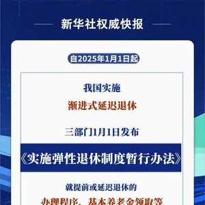 1月1日,人力资源社会保障部等三部门发布《实施弹性退休制度暂行办法》,就弹性退休的办理程序、基本养老金领取等方面作出明确规定。