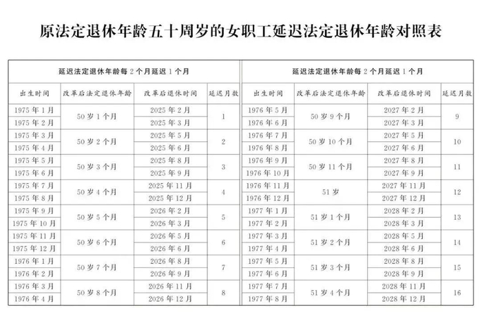 从2025年1月1日起,原法定退休年龄为五十周岁的女职工,法定退休年龄每二个月延迟一个月,逐步延迟至五十五周岁。