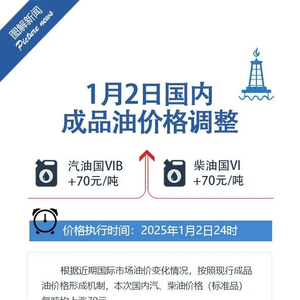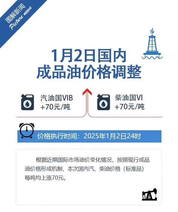 根据国家发展改革委消息,新一轮成品油调价窗口将于今天(1月2日)24时开启。根据近期国际市场油价变化情况,按照现行成品油价格形成机制,自2025年1月2日24时起,国内汽、柴油价格(标准品,下同)每吨均上涨70元。