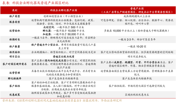 不同类型的园区REITs面向不同成长阶段的企业,租户客群有一定的区别。孵化器、加速器是指以促进科技成果转化、培育科技企业为宗旨,提供物理空间、共享设施和专业化服务的科技创业服务机构,主要面向小微企业及各类创业主体,企业经营风险较高,但多可享受相关政策扶持和优惠补贴,且项目一般位于较优质的地段。工业厂房等生产制造型园区、研发办公平台等商务型园区则面向较成熟的企业,客户粘性较弱,市场有较多可选择的同质化园区,项目所处区位差异较大。