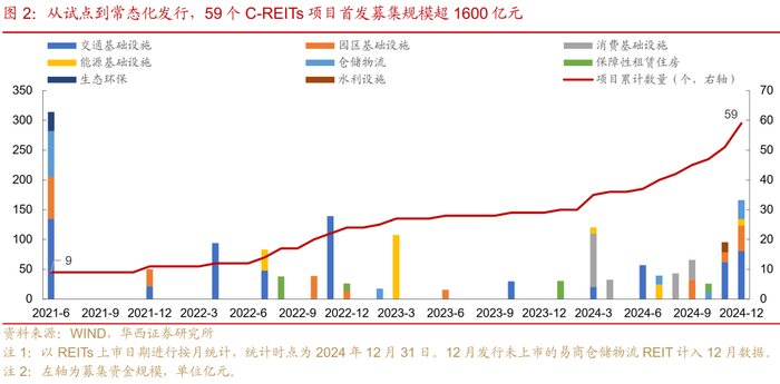 截至2024年12月31日,C-REITs已发行59个项目,共发售基金1630.7亿元,资产类型涉及园区、消费、交通、能源、生态环保、水利、仓储物流和保障性租赁住房八大类。此外,12月20日国泰君安济南能源供热REIT、汇添富九州通医药仓储物流REIT、华夏金隅智造工场产业园REIT、易方达华威农贸市场REIT首发审核通过,基础资产类型正不断丰富。