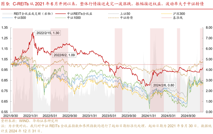 整体上看,C-REITs是一种短期波动较大、长期风险较小的投资品种。短期视角看,受各类偶然因素影响,1-3年的时间内项目的价格可能会有大幅波动,振幅接近权益市场水平(上市以来板块波动区间在-20%~+31%),波动率大于中证转债,有可能REITs价格的跌幅远大于分红的收入。长期视角看,从2021年6月开闸以来,整体行情接近走完一波涨跌,2024年底已回归至2021年刚上市附近点位。只要项目能正常出租“收租”或正常运营获得“收入”,价格的涨跌并不影响分红。此时,入手的成本越低,分红收益率越高,还能从价格涨跌的过程中择机获取资本利得。
