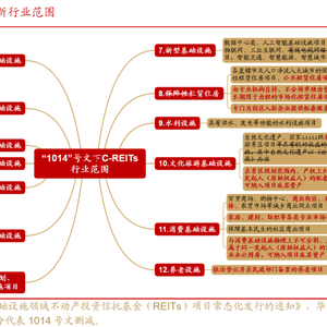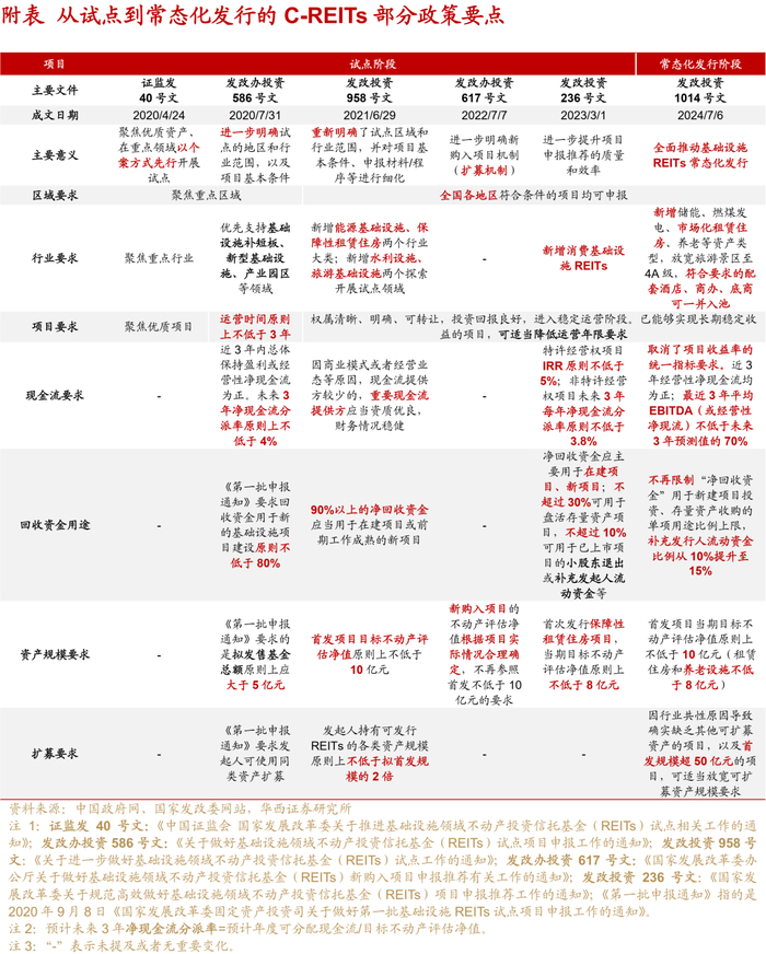 试点以来,C-REITs制度规则持续完善。“1014号文”将REITs行业范围拓展总结为12个大类,新增储能、燃煤发电、市场化租赁住房、养老设施等资产类型,并将旅游景区项目放宽至AAAA级,并允许园区、消费、文旅基础设施中符合要求的配套酒店、商业办公用房、底商可一并入池。此外,“1014号文”强调了底层资产的完整性,不再设置项目收益率的统一要求(此前要求产权类项目的净现金流分派率未来3年原则上不低于3.8%,经营收益权类项目的基金存续期内部收益率(IRR)原则上不低于5%),也不再限制“净回收资金”用于新建项目投资、存量资产收购的单项用途比例上限,并将补充发行人(原始权益人)流动资金的比例从10%提升至15%。总体上看,“1014号文”是近年来我国REITs规则体系建设的一次系统总结(C-REITs主要政策变迁见附表)。