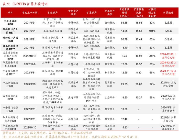 已有4只C-REITs实现扩募,且近期有多只C-REITs发布扩募公告。扩募机制是指REITs首次发行后,在存续期间内再次发行基金份额募集资金,用于新购入基础设施项目等用途的行为,从而实现基础设施REITs资产规模增加,并在一定程度上提升底层资产的分散度,增强项目组合的竞争力和分红的稳定性。2023年,2只仓储物流和2只产业园REITs完成扩募和份额上市工作,扩募募集规模50.64亿元,其中中金普洛斯REIT扩募规模最大,为18.53亿元;华安张江产业园REIT、博时蛇口产园REIT扩募规模分别为15.53、12.44亿元;红土创新盐田港REIT的扩募规模最小,为4.15亿元。2024年以来,光伏发电、保租房、产业园等多个类型的项目发布了拟扩募公告,预计募集规模约100亿元。