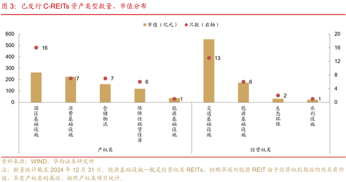 截至2024年12月31日,C-REITs数量上以产权类项目为主(37只),合计市值达804亿元,其中园区、消费基础设施分别为262、224亿元。经营权类REITs数量为22只,合计市值约781亿元,以交通基础设施为主,市值超553亿元。