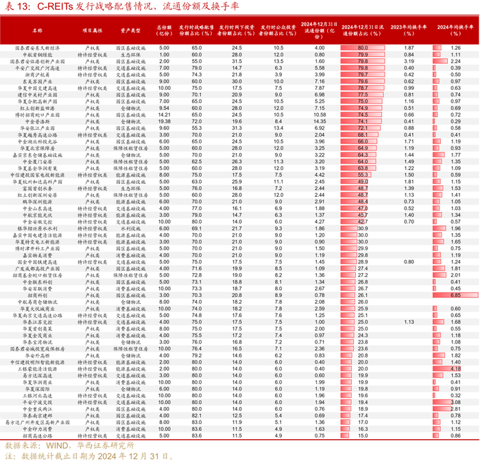 战略配售面临12到60个月不等的限售期,战配比例很高将导致刚上市及上市后一段时间内的REITs流通盘较小,二级价格容易受各类因素影响产生大幅波动。原始权益人及其关联方至少需要自持20%,这部分限售期60个月(5年),超过20%的部分限售期36个月(3年)。其他类型战略投资者限售期12个月(1年)。网下投资者自REITs上市之日起前三个交易日(含上市首日)内可交易的份额不超过其获配份额的20%,第四个交易日起,网下投资者的全部获配份额可自由流通。公众投资者份额不受限制。再结合换手率可以判断个券交易的活跃度。流通份额占比超过60%、2024年日均换手率超过1.2%的项目主要有国泰君安东久新经济REIT、国泰君安临港创新产业园REIT、嘉实京东仓储基础设施REIT和中金厦门安居REIT。