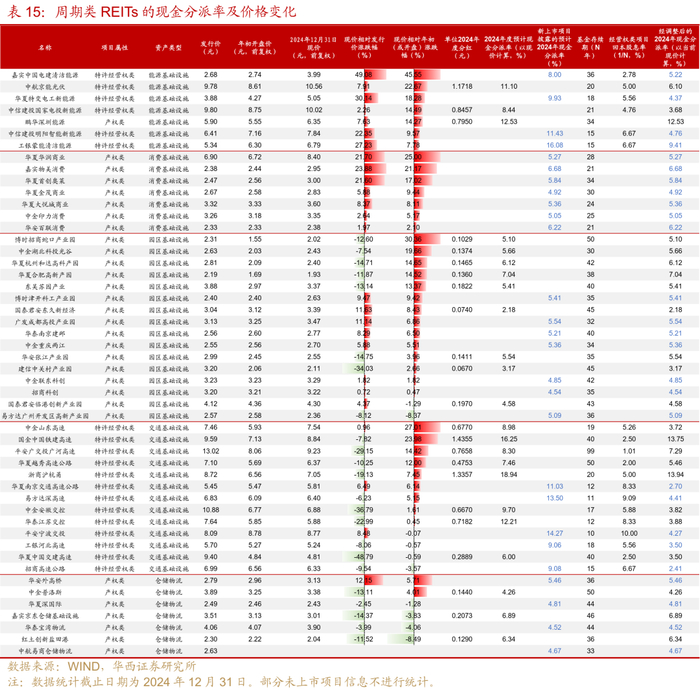 周期类REITs分派率均高于稳定类REITs,其中能源基础设施REITs最高,2024年度二级市场价格也普遍上涨,具有较高的市场热度,有挖掘空间。消费基础设施REITs整体表现也不错,2024年以来二级市场价格基本呈上涨态势,叠加消费政策的提振、项目又普遍处于城市核心位置,2025年值得跟踪。园区基础设施、交通基础设施REITs今年以来二级市场行情有所修复,博时蛇口产园REIT、中金山东高速REIT年初至今涨幅分别达30%、28%,但整体上较多项目仍然低于发行价,基本面还有待进一步恢复。仓储物流REITs项目整个板块承压明显,还需要留意2025年新增高标仓供给冲击带来的影响。周期类REITs由于项目收入存在一定的季节性波动或依赖管理人的经营水平,适合在行业景气度到来时或管理水平优异的背景下择时买入。