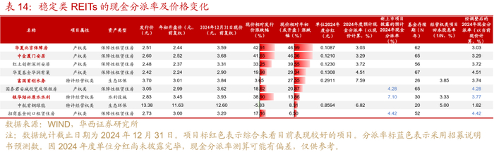测算来看,稳定类REITs中生态环保、水利设施、租赁住房项目经调整的2024年现金分派率较低,主要由于2024年以来三类REITs二级市场价格普遍上涨,平均涨幅分别在18%、14%、32%,一定程度上拉低了本年度的现金分派率,但对于年初便持有该类资产的投资者而言,“分红”+“资本利得”收益双丰收。结合前面基本面和流动性表现来看,中金厦门安居REIT、华夏北京保障房REIT、银华绍兴原水水利REIT、富国首创水务REIT可以在“合适低点”的价格买入并可长期配置持有,每年分红稳定性较强,买入的价格越低,分红收益率越高,资本利得空间也更有保障。