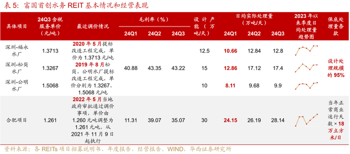 处理量方面,保底条款的设计使得REITs有基本处理量的支撑,具有一定的“兜底”作用。每个环保项目都有设计产能,但实际运行时会受到区域经济活跃度、周边项目竞争分流、季节性变化等影响,一般而言,夏季的进水量较大,负荷率较高,冬季的进水量减少,负荷率较低。富国首创水务REIT设置了“基本污水处理量”条款,如果某一运营年度实际处理达标的水量低于基本污水处理量时,可直接按照基本污水处理量收取污水处理费。这使得项目有了保底处理量(下限)和基本收入,而处理量上限可按照设施的安全系数对应负荷进行预测(首创水务REIT最高污水处理量上限为设计处理规模的1.3倍)。从2024年前三季度表现看,首创水务污水处理量稳中有升,产能利用率基本高于去年同期。