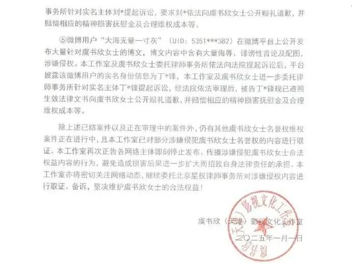 工作室还表示除上述已结案件以及正在审理中的案件外,仍有其他虞书欣名誉权维权案件正在进行中,且已对部分涉嫌侵犯虞书欣名誉权的内容进行取证。