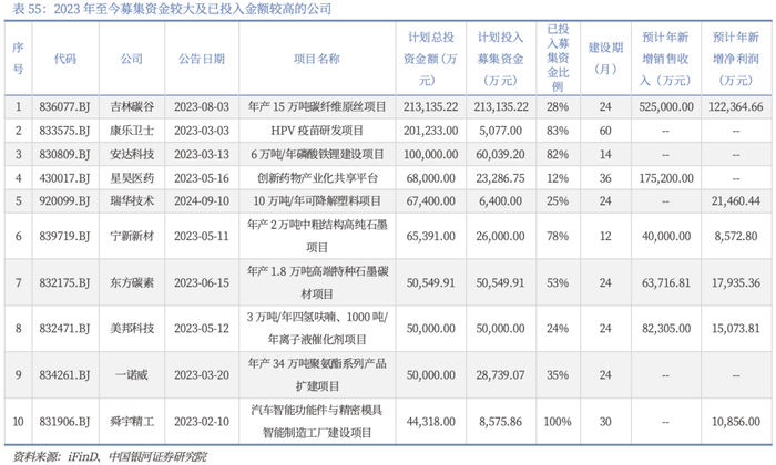 从产能方面来看,募投项目竣工带来的产扩张也有望助推公司成长。随着前期募投项目逐步落地,北交所公司产能释放有望推动增长预期。2022年,北交所上市公司共募集资金约167亿元,其中上市公司在北交所首发公司有83家,另有3家公司以定向增发的形式募集资金;2023年,北交所共有77家公司发行上市,募集资金共计147亿;2024年1-11月,北交所共有20只新股上市,合计募资金额约41.75亿元,绝大多数公司募集资金用于生产基地建设,生产线改造,以及投入研发中心建设等推动公司扩大生产并有利于公司可持续发展的建设项目。2023年至今,多家北交所上市公司募投项目进展迅速,计划投入募集资金比例较高,有望在短期内实现募投项目落地并实现产能扩张(见附表67)。
