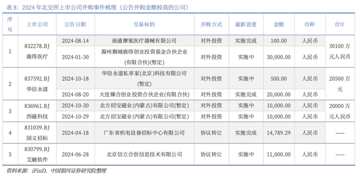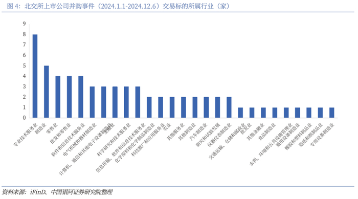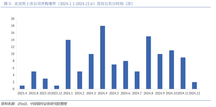 三是公司谋求出海发展,跨境并购机会增加。随着全球经济一体化的推进和各国市场的相互开放,跨境并购将成为企业拓展国际市场、获取海外资源和技术的重要手段。中国企业将更加积极地参与全球并购市场,在海外寻找优质资产和技术资源,提升自身的国际化水平。根据前述统计,2024年北交所上市公司发生的124家次并购事件中,有10家次的并购事件涉及海外,占比约8%。