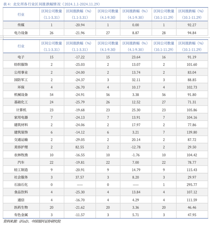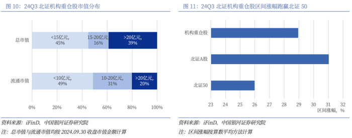 机构重仓股的中市值、大市值公司合计占比过半,区间涨幅跑赢北证50指数。市值分布方面,结合北交所上市公司的实际情况,我们将机构重仓股划分为大市值、中市值和小市值三类,具体标准为:“总市值>20亿元、15-20亿元、<15亿元”以及“流通市值>20亿元、10-20亿元、<10亿元”。根据这一划分,24Q3北交所上市公司机构重仓股在市值分布上相对均衡。在总市值和流通市值这两个口径下,中市值和大市值公司的合计占比均超过50%。2024年三季度,北交所上市公司机构重仓股的区间涨幅为28.93%,介于北证50指数(25.95%)与北证A股(31.01%)之间。
