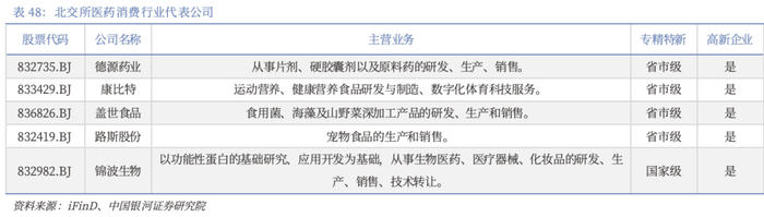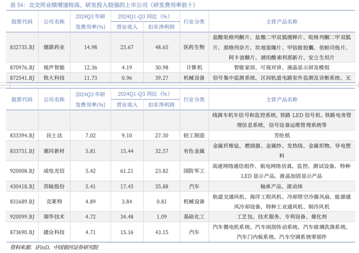 具体来看,较高且持续投入研发的公司将不断加强其核心竞争力,将有助于公司的可持续发展和成长扩张。从研发投入方面来看,近些年业绩增速较为稳健,且研发费用率较高的公司与新质生产力的发展方向一致。我们基于财务指标对260家北交所上市公司进行筛选,选取了一批过去三年营收、净利润复合增长率较高,研发投入较强的公司,并在此基础上筛去2022年-2023年和2024Q3营收、净利润曾出现负增长以及非专精特新的公司,最终得到22家公司(详见附表66),这些公司主要分布于汽车(5家)、基础化工(4家)、机械设备(2家)行业,以及生物医药、食品饮料等、国防军工行业。