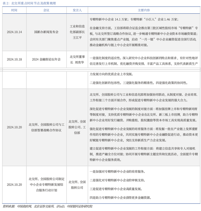 北交所制度细则频出,多维度助力板块健康发展。2024年北交所市场关注度持续增加,多项制度细则接连出台,主要以“深改十九条”以及“国九条”框架下的详细规则和指引为主,覆盖上市企业监管、上市公司业务细则等众多领域。自2023年“深改十九条”推出后,其相关细则的陆续落地,优化了上市企业的发行流程,进一步严格监管制度,使北交所服务于创新型中小企业的特色定位更加凸显,显著提升了北交所的品牌吸引力与市场影响力。