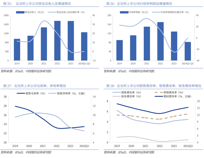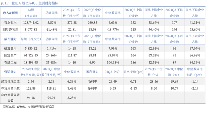 2024年前三季度北交所上市公司业绩阶段性承压。营业收入方面,2024Q3营业收入总额同比下降5.57%,中位数同比增长4.61%,具体看152家公司2024Q3营业收入同比上涨,107家公司同比下跌;归母净利润方面,2024Q3归母净利润总额同比下降21.48%,中位数同比下降18.77%,具体看115家公司2024Q3同比上涨,144家公司同比下跌;2024Q3北交所上市公司毛利率中位数同比减少1.14pct,净利润中位数同比减少2.19pct,经营性现金流中位数同比增长6.39%。