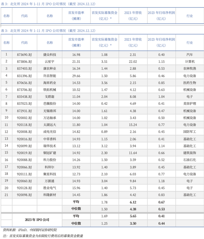 2024年北交所发行上市公司的盈利及营收规模均有提升。对比2024年1-11月新上市发行的公司与2023年的整体情况,今年北交所IPO公司的募集资金均值和中位数水平均较去年有所提升。从发行上市公司的营业收入来看,今年新上市的公司2023年营业收入均值超6亿元,其中营业收入水平较高的有云星宇(22.02亿元)、太湖远大(15.24亿元)、铜冠矿建(11.64亿元);实现归母净利润的均值约为0.67亿元,其中归母净利润水平较高的有万源通(1.18亿元)、云星宇(1.15亿元)、瑞华技术(1.14亿元);相比2023年上市发行公司的归母净利润均值0.41亿元,有较大幅度提升。