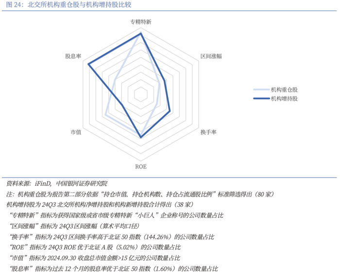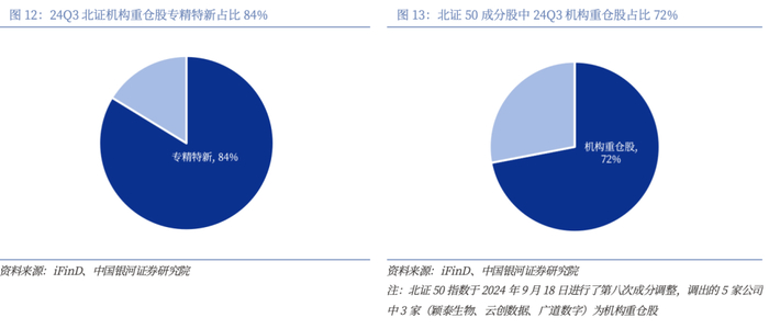 “专精特新”占比高,机构重仓偏好北证50成分股。2024年三季度,在80家北交所机构重仓上市公司中,67家获得国家级或省市级专精特新“小巨人”企业称号,占比高达84%;此外北证50成分股中有36家公司获得机构重仓持股,占比为72%。