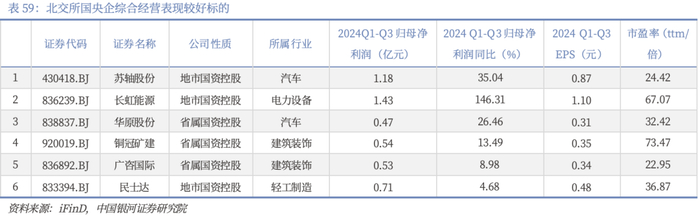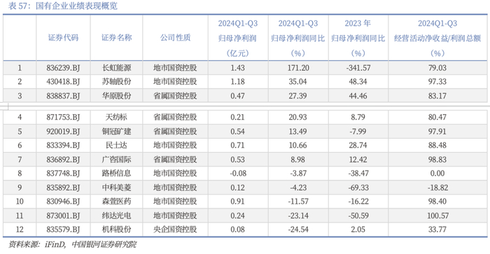 2024年前三季度国有企业普遍实现正利润,同比最高增长超170%。从2024年三季报业绩来看,北交所全部24家国有企业中有20家归母净利润为正,其中7家实现归母净利润同比正增长,苏轴股份、民士达、广咨国际连续两年保持正增长。从公司经营活动净收益和利润总额的比值所反馈的经营质量来看,2024年前三季度,纬达光电净现比超过1;苏轴股份、广咨国际、铜冠矿建和森萱医药4家公司的净现比均接近1;其余大部分公司也保持在80%左右的水平,利润表现有经营活动支持,业绩可靠性与可持续性有较强支撑。