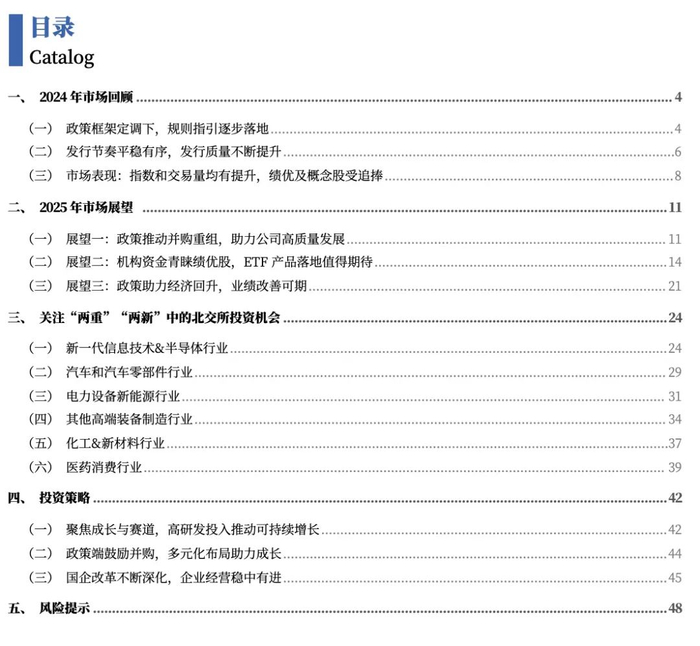 对于2025年投资策略,我们推荐三个主要方向:1)聚焦北交所新质生产力,关注具有成长潜力,布局热点赛道的公司,其一是业绩增速高、研发投入强的成长性公司,其二是募投项目产能释放助推业绩成长的公司;2)政策端鼓励并购,叠加北交所公司注重多元化布局及横向纵向拓展,关注进行产业链协同扩张或计划海外布局的公司;3)关注北证国央企,聚焦净资产收益率高、经营风险较低的稳健性公司,以及有持续成长能力或着力打造第二增长曲线的成长属性公司。