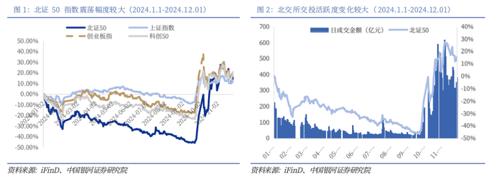 北证50指数全年表现较为突出,近期呈现震荡行情。总体来看,北证50指数在2024年的表现较为突出,指数在1月有30%左右的回撤,随后2月有一定的上涨回升,从3月至9月间指数呈现持续震荡下行的趋势,北证50指数在9月末至10月间迅速反弹,短期内指数实现翻倍增长。随后又经历了几次波动,但整体保持在较高的水平。