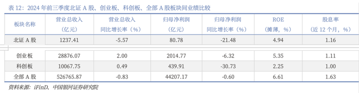 板块间业绩对比分析显示,A股上市公司2024年前三季度整体业绩承压。北证A股在营业总收入和归母净利润的绝对规模上,与创业板和科创板仍存在较大差距。从财务指标来看,2024Q3北证A股的归母净利润同比增长率和ROE相对表现优于科创板,弱于创业板;近12个月的股息率表现优于创业板和科创板。