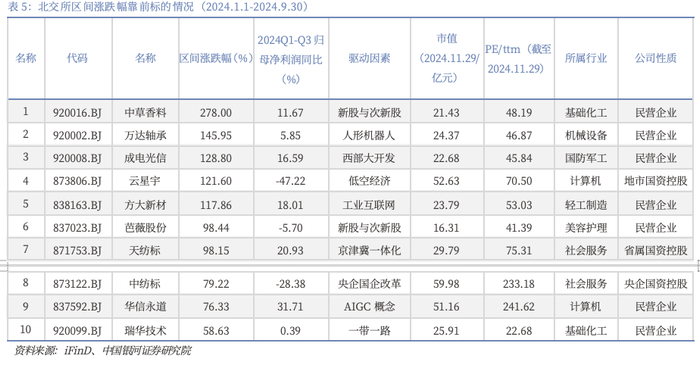 从个股涨幅角度看,可分为两个阶段,第一阶段:从年初至9月30日,上涨排名前十的个股大部分是新上市的标的,今年前三季度业绩较好的公司也表现较优。区间涨跌幅靠前的公司中,有5家公司都是今年新上市的股票。由于新上市标的的规模与质量提升,新股与次新股的关注度保持在高位。