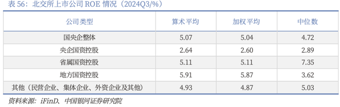 对比北交所的国央企公司和其他性质公司盈利能力,从净资产收益率水平来看,国央企整体水平与其他性质上市公司的盈利能力旗鼓相当,但国央企中,省属国资控股的上市公司整体盈利能力更胜一筹,2024年前三季度净资产收益率的加权平均值为5.11%,净资产收益率的中位数水平也较高。