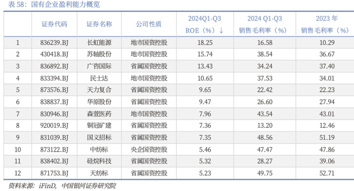 从盈利能力来看,2024年前三季度,北交所24家国有企业中有20家净资产收益率为正,其中长虹能源、苏轴股份、广咨国际、民士达位于前列。销售毛利率方面,天纺标、国义招标、中纺标、森萱医药4家公司超过40%,有8家公司的2024年三季报毛利率较2023年年末有所提升。