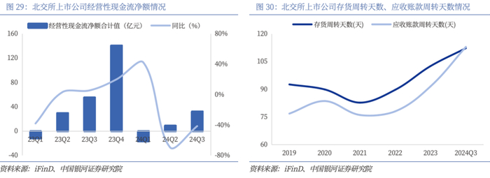 营运效率方面,北交所上市公司24Q3经营性现金流净额为32.41亿元,环比继2024Q2实现由负转正后持续改善,但同比仍然下降41.50%。24Q3存货周转天数为112.18天,应收账款周转天数为112.91天,均呈现上升趋势。