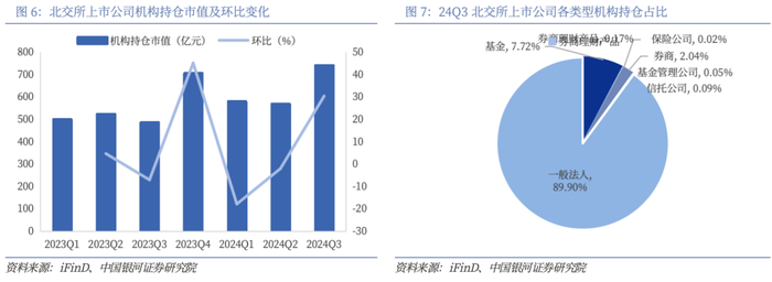 24Q3机构持仓总市值环比增长,主要受股票价格上涨驱动。截至2024年三季度,北交所上市公司机构持仓总市值上升至741.18亿元。其中,24Q3机构持仓股数为59.55亿股(环比增长4.96%),同期北证A股区间涨幅为28.11%。按机构类型具体拆分,24Q3北交所上市公司机构持仓中排名靠前的机构类型分别为一般法人、基金、券商,以机构投资者为代表的长期资金的引入在提振市场信心的同时有望提升北交所的市场流动性、增强市场稳定性。